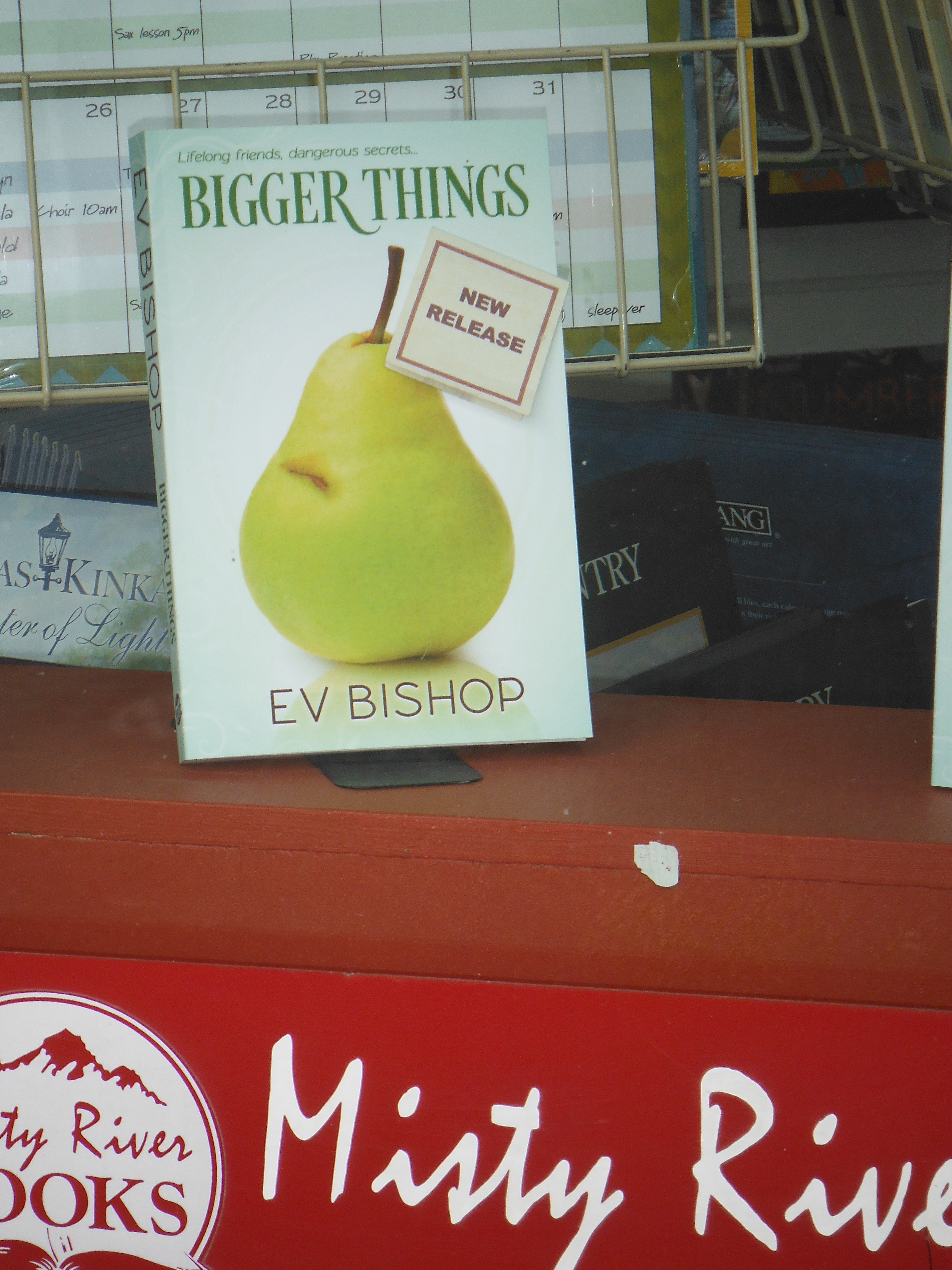 Okay, okay . . . I fully admit the title of this post is a tad corny (or perhaps more than a tad!), but seeing BIGGER THINGS—a novel by me!—in the window of my long-time favourite bookstore, Misty River Books, did made my insides jump and skip like a playground full of happy six-year-olds!