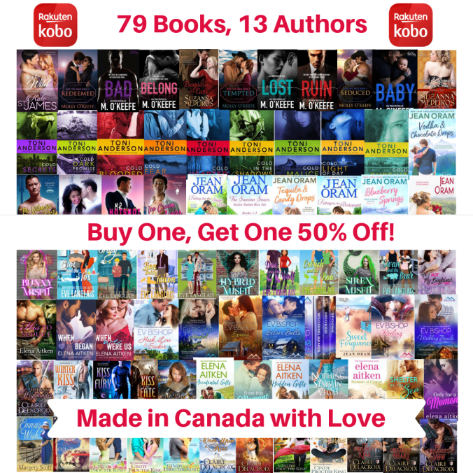 It’s Buy 1, Get 1 50% off, but there are no limits. You can mix-and-match authors, and/or buy as many titles as you want, paying regular price for one, 50% for the next, and so on. In fact, if you’re feeling extra wild, LOL, you could buy 40 books and then get the remaining 39 at 50% off each. (And hidden away on your eReader, no-one will ever know how much you treat yourself! 😁)