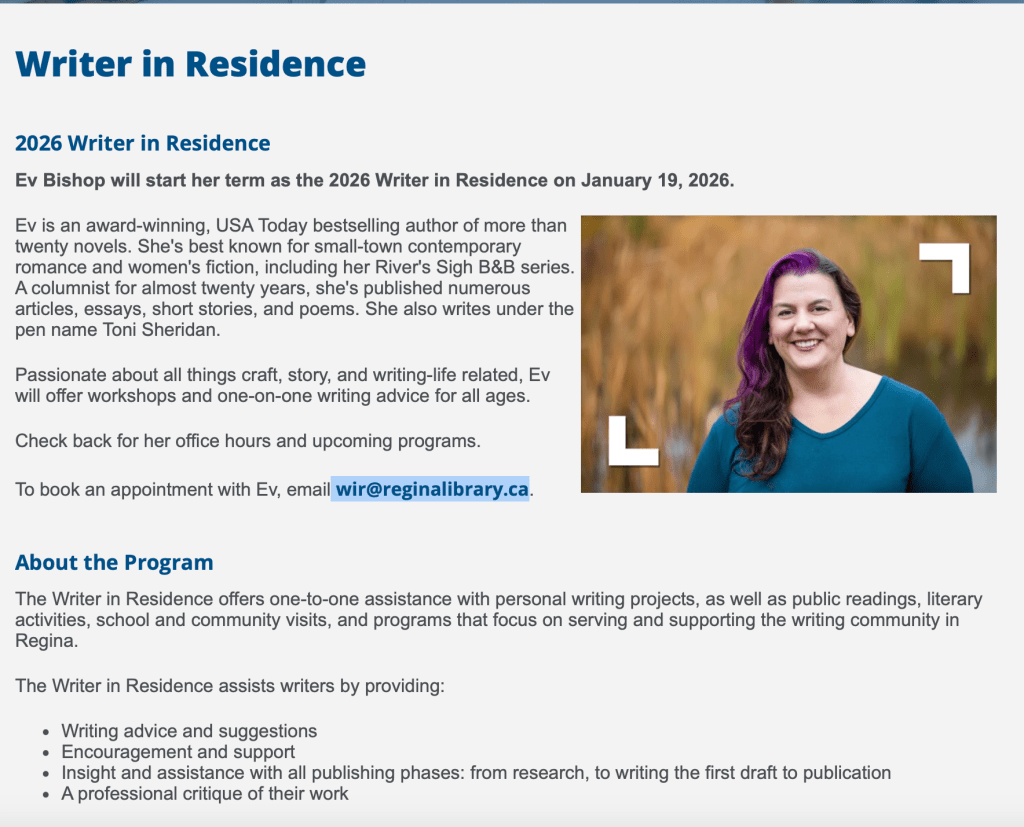January 19 – June 28, 2026: I’m thrilled to announce that I am the Regina Public Library’s Writer-in-Residence this year.